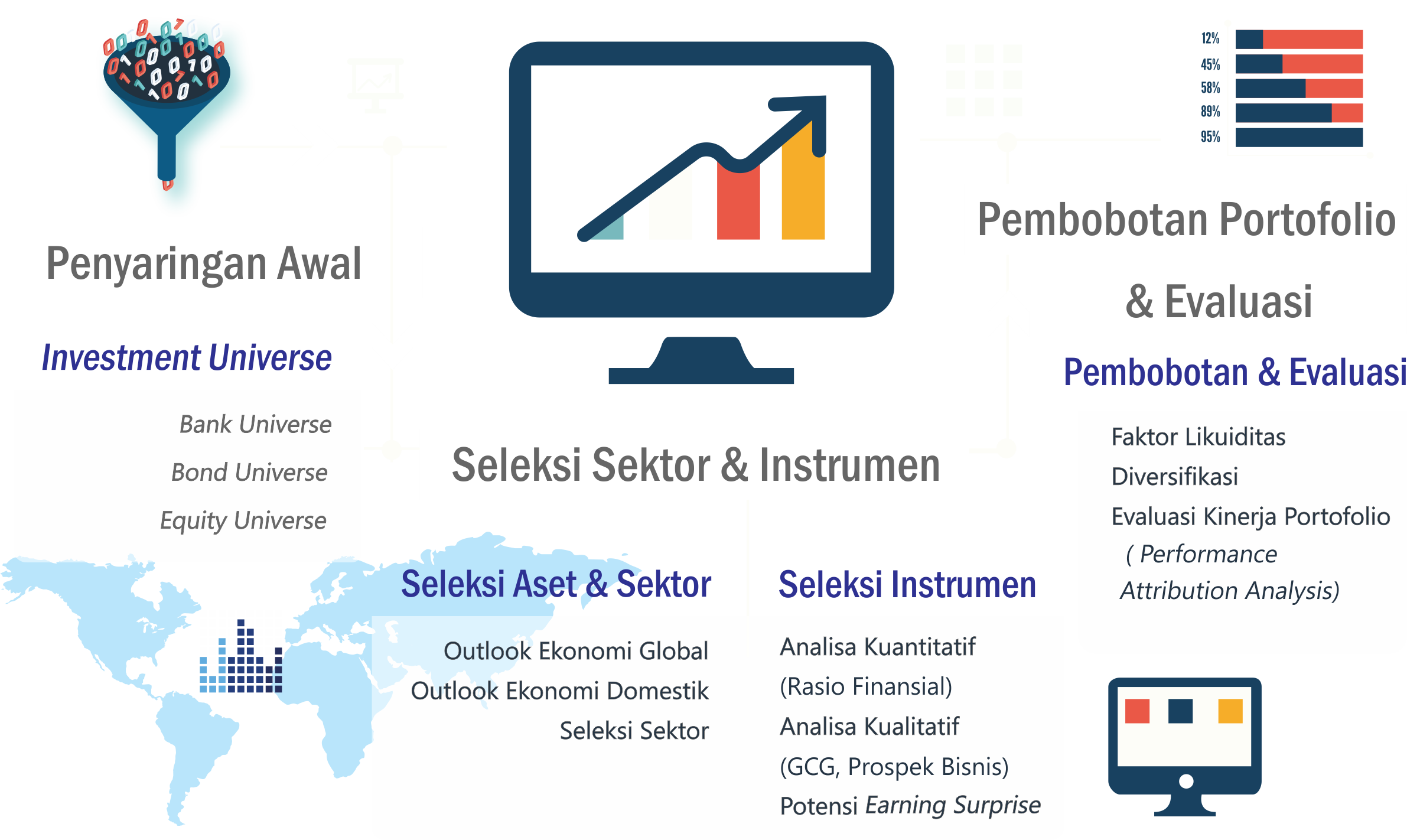 Proses investasi kami dilakukan dengan menggabungkan pendekatan top down analysis untuk melihat tren sektoral serta pendekatan bottom up analysis untuk mengidentifikasi perusahaan yang menarik baik dari nilai intrinsik maupun dari sisi pertumbuhannya yang seluruhnya diawasi oleh Tim Manajemen Risiko dan Kepatuhan.